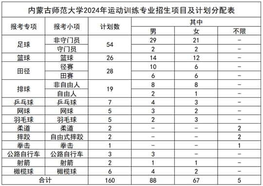 2024年运动训练专业面向全国招生160人,招生计划纳入内蒙古师范大学年度本科招生计划总规模,具体项目及计划数见下表: