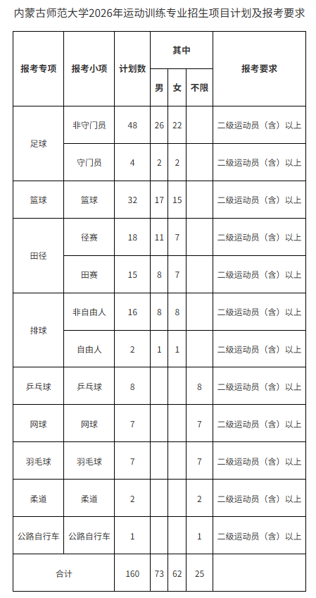 2026年运动训练专业面向全国招生160人。招生计划纳入内蒙古师范大学年度本科招生计划总规模,具体项目见下表: